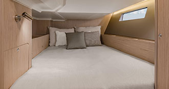 On deck, the yacht is designed with both sailors and guests in mind. A spacious cockpit with twin helms provides excellent visibility and control, while the fold-down transom transforms into a generous swim platform for easy access to the water. Wide side decks, flush hatches, and thoughtfully positioned winches ensure safe and efficient sail handling, even when short-handed.